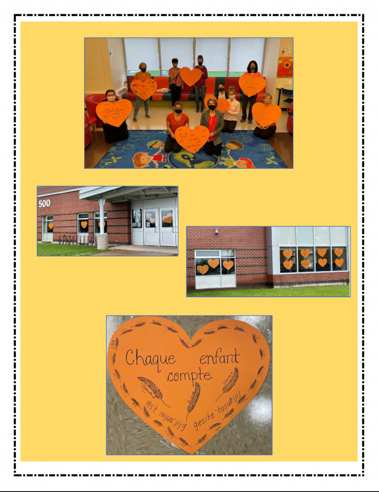 À l’école Sainte-Thérèse, les élèves de chaque classe et les membres du personnel inscriront leurs noms, accompagnés de mots d’espoir et d’encouragement ou de messages positifs sur de grands cœurs orange. Ces cœurs seront ensuite placés devant l’école afin de créer un jardin de cœurs orange.