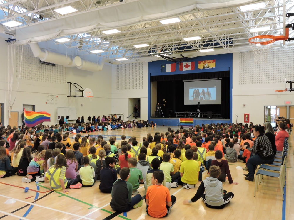 ExpiréPour clôturer la Semaine provinciale de la promotion de la diversité et du respect, tous les élèves de l’école ont participé ce matin à la création d’un drapeau arc-en-ciel «humain». De plus, ils ont profité de l’occasion pour interpréter la chanson «On écrit sur les murs» du groupe Kids United, et ce, au rythme des gobelets Speed Stacks.