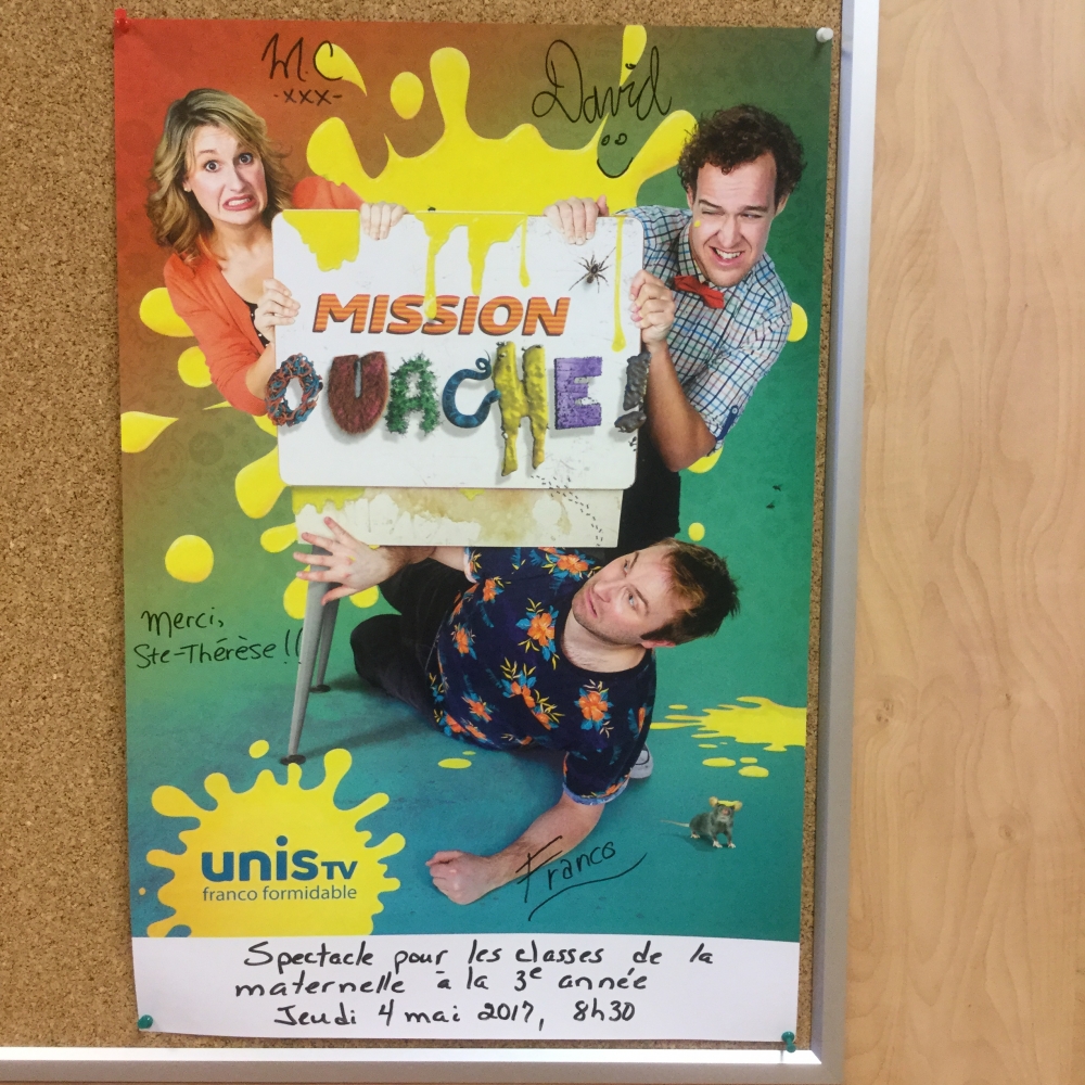 Les enfants de la maternelle à la 3e année ont adoré le spectacle «Mission Ouache!» présenté au gymnase de l’école ce matin! Vous pouvez découvrir les prochaines mésaventures de ces trois comédiens en regardant l’émission jeunesse Ouache! de UnisTV. Pour plus de détails, veuillez cliquer sur le lien suivant :http://unis.ca/ouache